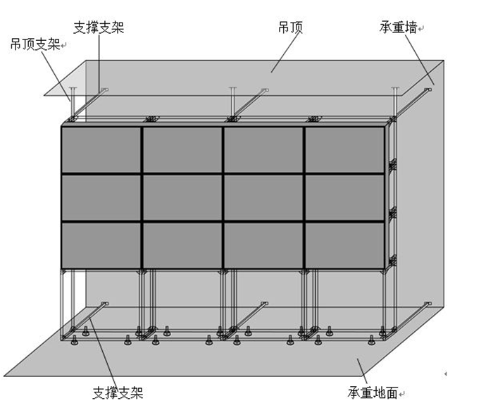 安裝基座一般直接與抗靜電地板接觸,以保證地面長期承重受力不變形。安裝在墻壁上則要注意墻壁的承載能力和墻體的結(jié)實(shí)程度,而且墻壁和屏幕之間要留有大于10-20CM的散熱空間以保證熱量排出。地面要求平整結(jié)實(shí),承重力強(qiáng),不變形。