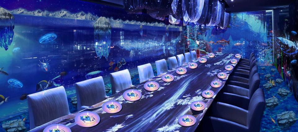 沉浸式投影餐廳指一個完全沉浸式的投影式虛擬現(xiàn)實系統(tǒng),用幾米高的4個平面組成的立方體屏幕環(huán)繞在觀眾周圍,設(shè)置在立方體外圍的4個投影設(shè)備共同投射在立方體的投射式平面上,觀眾置身于立方體中可同時觀看由五個或六個平面組成的圖像,完全沉浸在圖像組成的空間中。