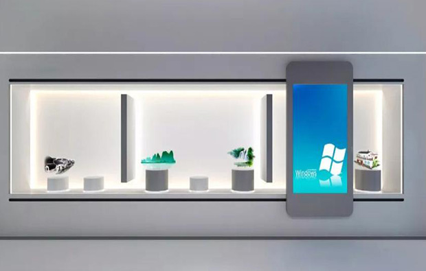互動滑軌屏?作為一種新型的展示方式。由定制滑行軌道、等離子電視、紅外傳感器、燈箱、計算機組成。在類似坐標軸的展墻上布置展板或液晶拼接屏作為背景墻,同時在前面安置一組可滑動的機械結構以懸掛液晶電視。觀眾可以用手推動液晶電視在軌道上移動時,液晶電視感應到的觸點都會自動播放圖片、文字或者視頻,不僅僅展示信息量大,而且節省場地,讓參觀者一目了然。
